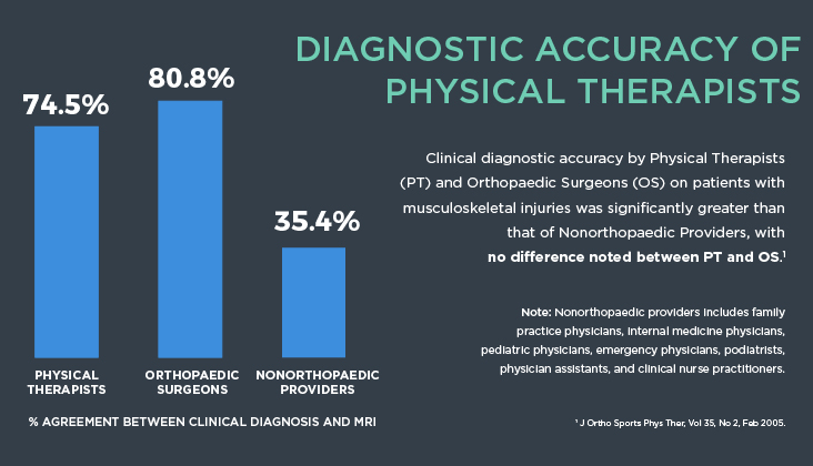 La precisión del diagnóstico clínico de los fisioterapeutas y cirujanos ortopédicos en pacientes con lesiones musculoesqueléticas no es estadísticamente diferente. Ambos proveedores tuvieron una precisión significativamente mayor que la de los proveedores no ortopédicos. (Como en, doble ¡la exactitud!)