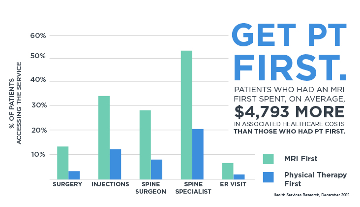 Por último, un estudio de Investigación de Servicios de Salud de 2015 encontró que se demostró que el costo promedio de la atención era $4,793 más si un paciente se sometió primero a una resonancia magnética versus ver primero a un fisioterapeuta. El estudio también muestra el mayor uso de otros servicios como imágenes de diagnóstico adicionales y medicamentos cuando la resonancia magnética se realiza antes de la fisioterapia.